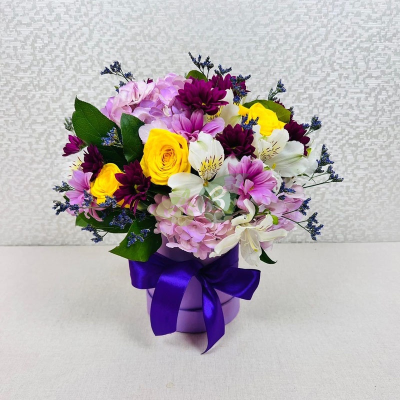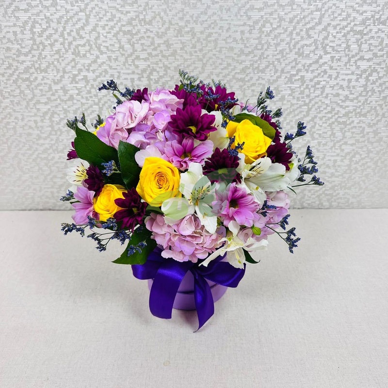 При покупке композиции из фиолетовых цветов в коробке доставка по Абакану будет бесплатной.