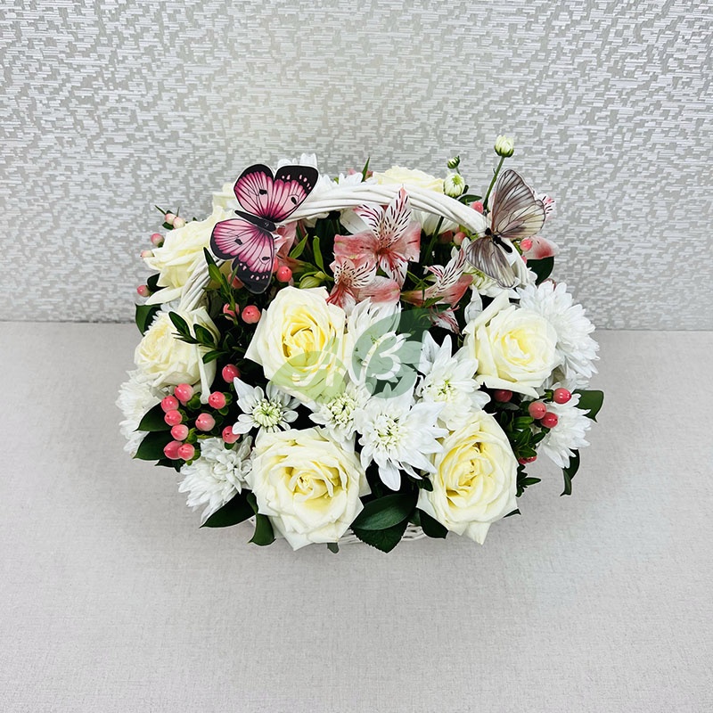 Спокойствие и гармония – это ассоциации, которые вызывает корзина с цветами “Нежный аромат”. Белоснежные розы в композиции с хризантемами выглядят стильно, роскошно и ненавязчиво говорят о привязанности дарителя.