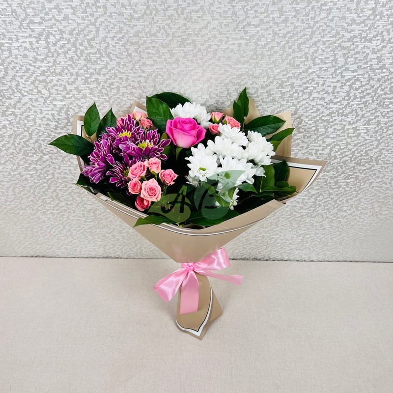 Сборный букет из кустовых роз и хризантем – это недорого и красиво. Такие цветы можно покупать для разных праздников и вовсе без повода.
